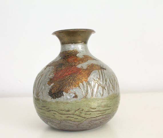 Sehr guter und unbeschädigter zustand. Verkaufe eine vintage retro vase blumenvase mit vogelmotiv von globe shopper exklusiv. Globe shopper exklusiv vase messing handgemalt 22 5cm hoch braun silber gold. 2 fliegende wildenten 60er 70er jahre.